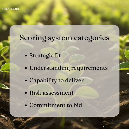 There are also many different scoring systems available to measure and evaluate if you should proceed. Our system breaks down a checklist of questions into five key categories to provide an overall score determining your Bid or No Bid decision:
